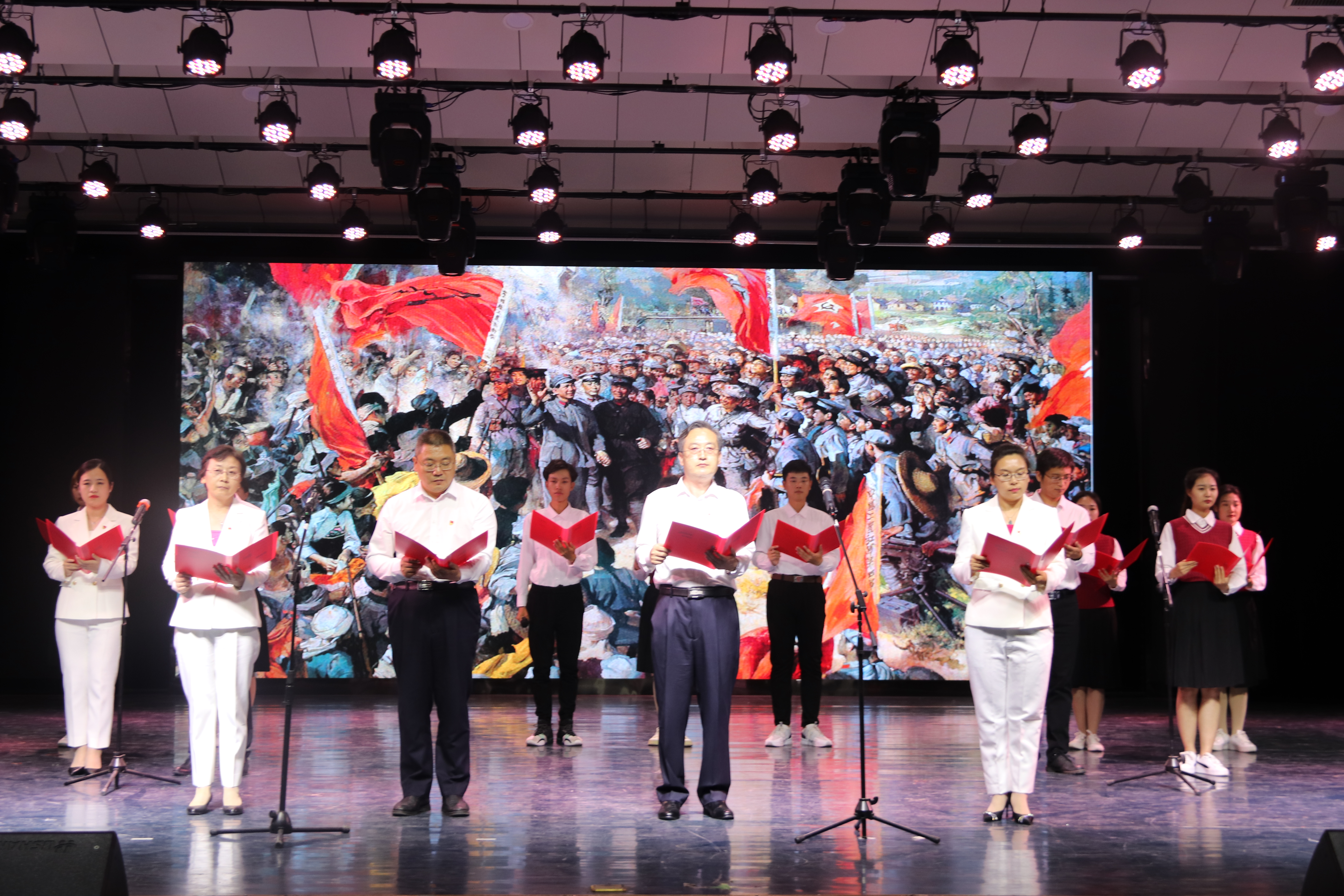 在主持人赵文杰激情澎湃的开场白中诗剧正式拉开序幕。诗剧以时间为线,分为雄关漫道真如铁、天翻地覆慨而慷、百年荣光看今朝三大篇章。