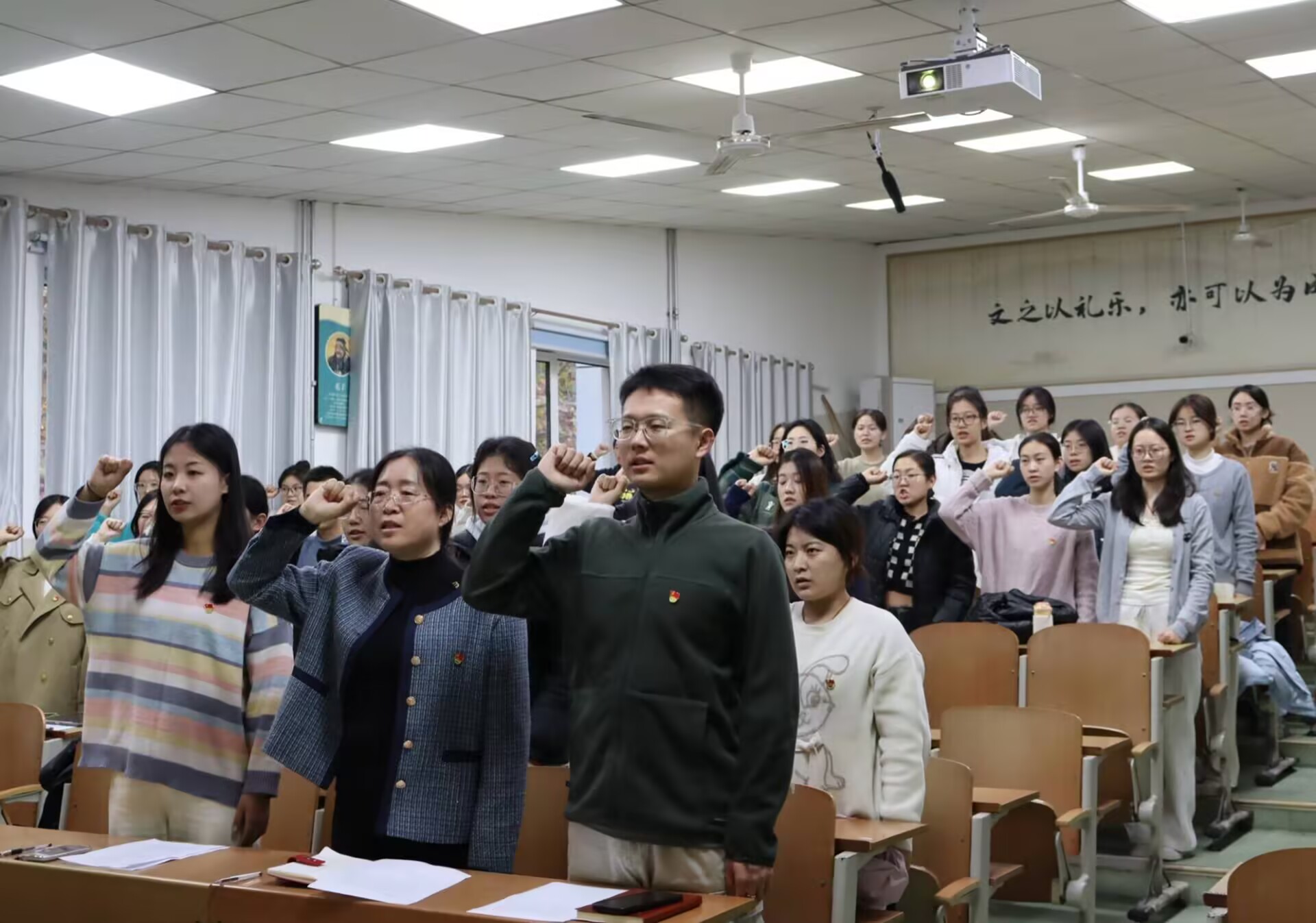 大会在庄严肃穆的国歌声中拉开帷幕。会议主要围绕于蕊等9名预备党员转正事宜展开深入讨论与审议,严格依照预备党员转正流程,于蕊、曹熠阳、唐钰杰等9名预备党员依次宣读转正申请,向党组织汇报一年预备期内在思想、学习、工作等各方面的情况,总结自己的优点与不足并表明今后努力的方向,表达自己加入中国共产党的意志和决心。入党介绍人王伟伟、贾瑞清、徐一凡分别介绍9位预备党员的综合表现,肯定她们的成绩并提出意见和建议。随后,有表决权的正式党员对于蕊等9名预备党员的转正问题进行投票表决,一致同意于蕊等9名预备党员按期转为中共正式党员。贾瑞清宣读支部大会决议:于蕊等9名预备党员思想进步,严于律己,在预备期内认真学习党的路线、方针、政策,努力提高自身素质素养,积极参加党支部的各项活动,在工作与生活中发挥先锋模范作用,用实际行动践行党的宗旨,已基本具备正式党员的条件,同意接收为中共正式党员。会议最后,在张佳骏的领誓下,全体党员重温入党誓词,誓言朗朗,掷地有声,饱含着对共产主义事业的无限忠诚,对人民幸福的深切担当。