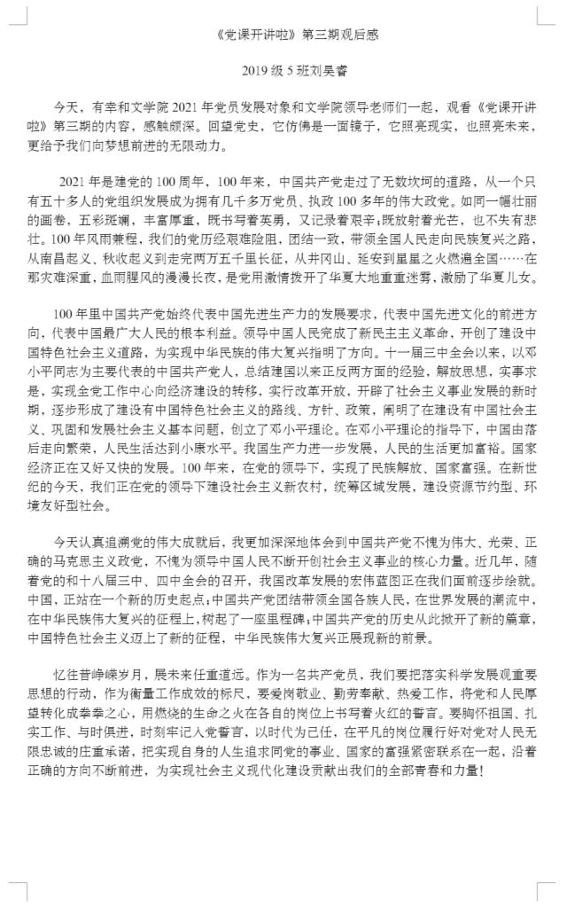 听党课筑党魂,学党史提觉悟。全体与会人员共同观看视频,主讲人杨凤城对党的伟大成就进行讲解。杨凤城表示从三十年制度来看,中国百年以来富起来强起来的变化离不开中国共产党。中国共产党的领导是历史和人民的选择,坚持和完善党的领导,是党和国家的根本所在、命脉所在,是全国各族人民的利益所在、幸福所在。视频中姜丽娟借下姜村的蝶变来阐释共同富裕,一村富不是富,一起富才是富。有盐同咸,无盐同淡。此外,杨凤城还强调马克思主义思想是立党立国的根本思想要走出中国特色社会主义道路会后,同学们发表自己的党课心得,书写内心的感悟。江山就是人民,人民就是江山,守江山,守的就是民心。同学们表示《党课开讲啦》的感召,是一种信仰的传承。伟大思想领航,汇聚出彩力量,将伟大建党精神置顶,用建党精神立根树魂,续写百年荣光。