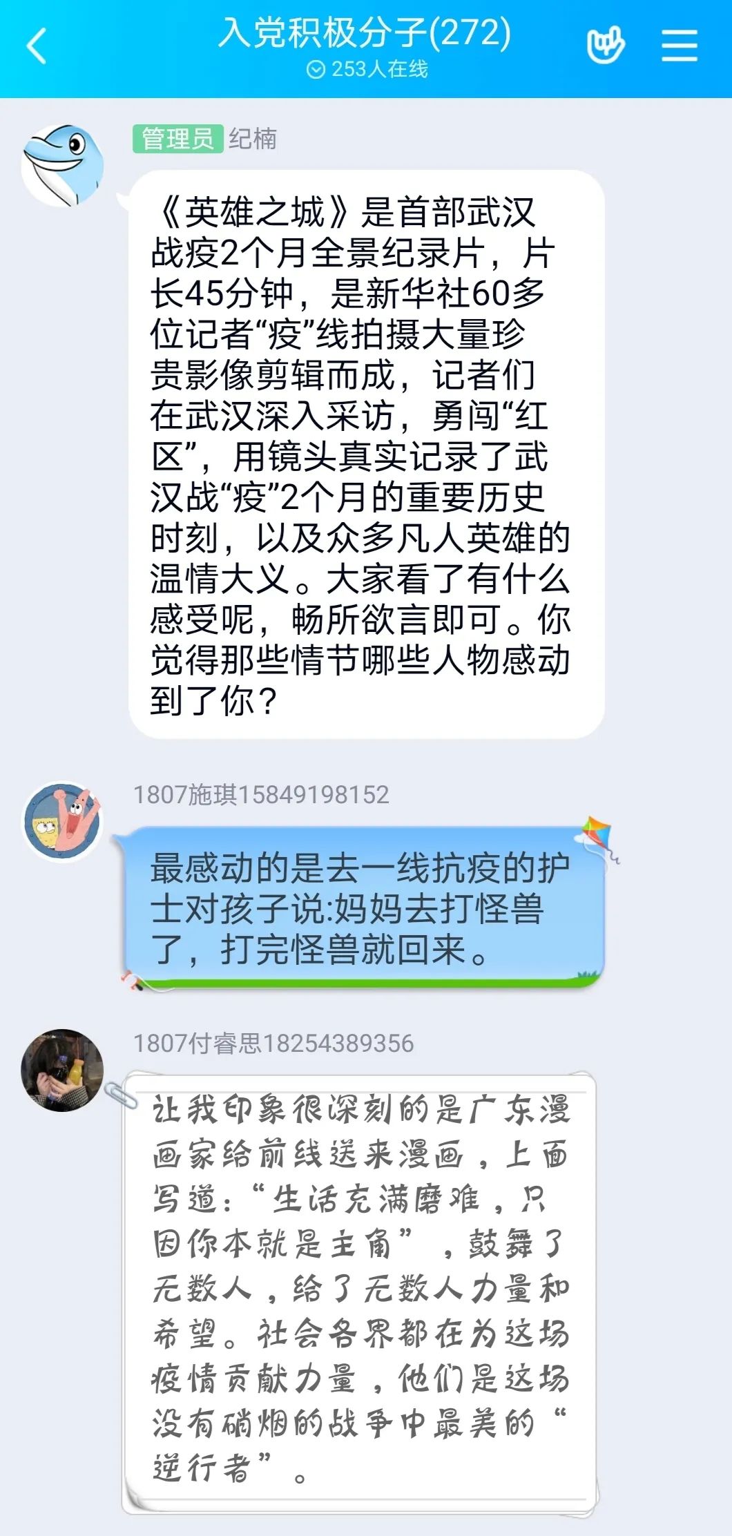在纪楠的自我介绍下,活动慢慢地拉开了帷幕。本次党课学习,根据学校党委要求,由纪楠组织观看视频《英雄之城》。同学们积极地将自己观看视频的照片发放到活动群中。不仅如此,同学们更是在观看完视频后,借鲜活生动的语言抒发自己观看后的感悟。郭召伟字里行间表达出习近平同志为核心的党中央始终把人民群众生命安全和身体健康放在第一位,重点支持疫情防控工作的认识;李宝田一字一言间说明了武汉人民用同心协力、英勇奋斗的实际行动,彰显了中华民族同舟共济、守望相助的家国情怀,展现出了不怕牺牲、勇于担当的、顾全大局、甘于奉献的精神的深刻情感;纪楠强调抗击疫情,不仅仅是党委、政府和医护人员的事,每个人都不能置身事外,每个人都是抗击疫情链条上的一环,都有自己的防护职责和战斗任务,关键时刻,只有相互协作,建立起政府、社会、个人各方休戚与共、有机互动的命运共同体,才能共克时艰,夺取最后胜利。活动就在同学们的热烈表达中缓缓落下帷幕。