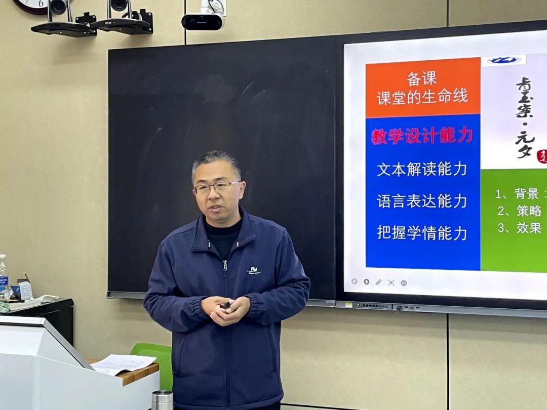 张老师从“如何上好一堂语文课”入手,与实际教学课堂相结合,主要讲解了教师应具有的教学设计能力、文本解读能力、语言表达能力、把握学情能力。在教学设计能力上,他以《青玉案》和《反对党八股》教案为例,指出在教学设计中思路结构最重要,清楚本节课在本单元的位置,设计问题串,掌握常见框架。并以《念奴娇·赤壁怀古》教学目标为例,讲解了教学目标叙写“四因素法”。在文本解读能力上,张老师指出文本解读是语文教师的第一基本功,介绍了三种最基本的语文学习活动:“阅读与鉴赏”、“表达与交流”、“梳理与探究”。他详细讲解了孙绍振的文本解读六法,即还原法、替换法、矛盾法、专业化解读法、类比法、作者身份法。
