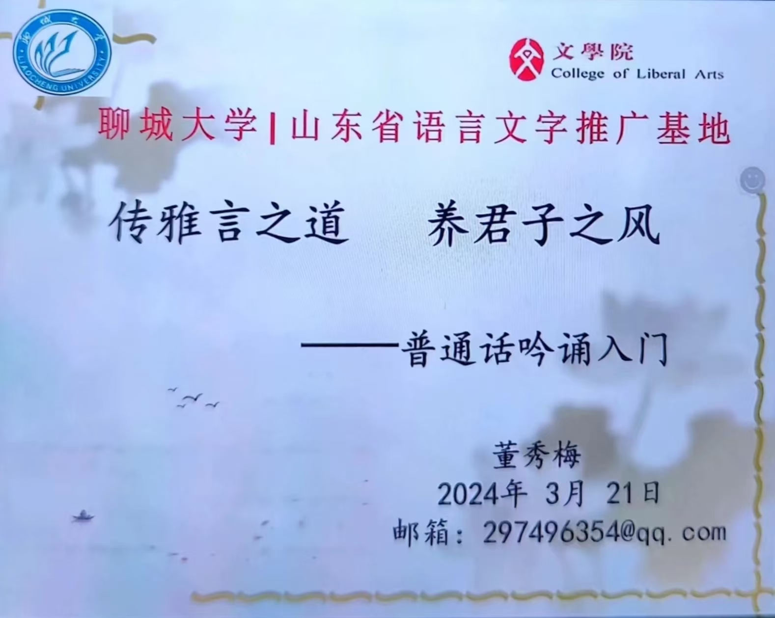 3月21日,向日葵视频 山东省语言文字推广基地吟诵团指导教师董秀梅为向日葵视频 2023级学科教学(语文)专业研究生做普通话吟诵入门主题讲座,向同学们传授普通话吟诵技巧与精髓。