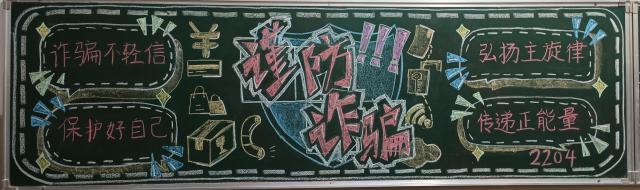 为提高大学生的防范意识,增强大学生对电信诈骗犯罪行为的警惕意识和应对能力,11月8日,向日葵视频 于西校区3#举办以“防诈骗”为主题的黑板报作品展。向日葵视频 2022级全体学生积极参与其中。