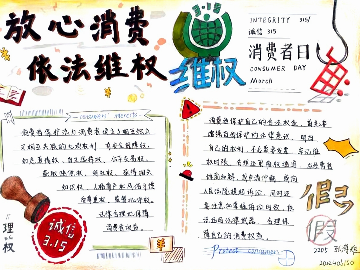 增强自我保护意识,提高科学消费水平。参赛同学以绘制手抄报的方式表达自身对消费权益保护的见解。2022级2班邓飘的手抄报内容简洁明了,图文并茂,左下角的“3·15”图案突出主题,右下角象征公正的天平表明消费者权益保护的正当性。2022级2班谷唯嘉的手抄报色彩鲜明,通过金钱、网购以及天平等元素呼吁同学们理性消费,依法维权。2021级8班孙浩然在手抄报中将“真”与“假”二字进行拼合,展示出“3·15”国际消费者权益日“打假”的宗旨,构思巧妙,意蕴深刻。2022级3班孙源桧的手抄报借“土坑”酸菜、双汇火腿肠等案例揭露食品安全问题,并表达了今年“3·15”全国消协组织消费维权年“提振消费信心”的主题。