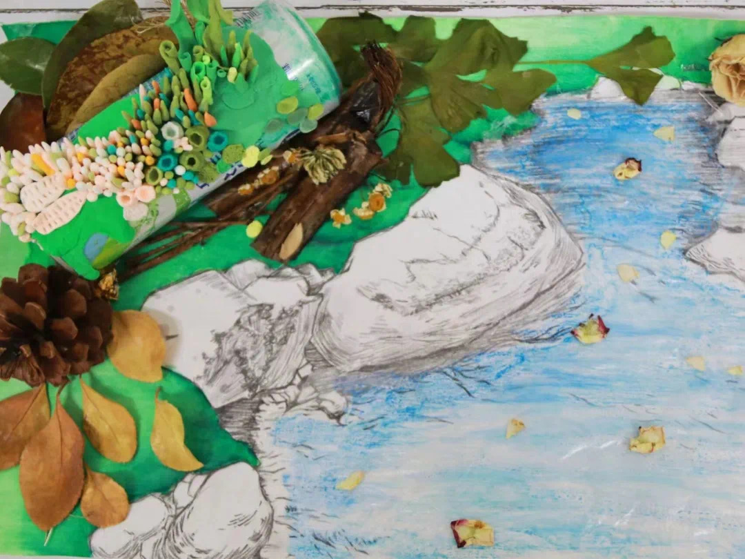 天生我“材”必有用,变废为宝创美好。参赛同学灵活运用灵巧的双手和丰富的奇思妙想,对平时不起眼的废旧物品进行装饰改造,使它们焕发出新的活力。2022级2班张馨婷巧妙构思,以落花、树枝、松果等为点缀入画,山坡叠青泻翠、湖水碧波荡漾,实现立体与平面的碰撞,展现出一幅绿意盎然、生机勃勃的泼墨水彩画。“指薪修祜,永绥吉劭。”2022级3班王慧琳将祝福融入作品,以竹筷和宣纸为材料制成一个温馨精巧的灯笼。灯笼四面皆有毛笔书写的祥瑞诗句,点点灯光,温暖人心。“风恬日暖荡春光,戏蝶游蜂乱入房。”2022级2班宿辰博以蝴蝶为主体进行创作,作品中蓝色蝴蝶精致生动,惟妙惟肖地展现出蝴蝶活泼灵动的飞舞之姿,另一类蝴蝶由碎玻璃拼接而成,一点黄绿色为其增添几分动人的春意。2021级4班马晓红用纸巾与卡纸制成玫瑰花束并用鲜花加以点缀,作品中花朵各表一枝,有的含苞待放,有的绚烂盛开,繁花似锦,娇艳欲滴。