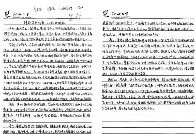 本次安全征文大赛活动中,参赛同学用心写作,呈现出众多优秀作品,为大家普及消防安全知识,敲响消防安全的警钟。2021级9班的于子宣同学以老子的“天下大事,必作于细”为线索,多次引用文言文、名句,从防范火灾的细节出发,讲解可能诱发火灾的因素,指出擦除诱发火灾危险因子的方法。2023级4班的房关菊同学在征文中向我们介绍学生宿舍规范用电行为,同时从学校制度以及管理层面列举有利于提高宿舍安全水平的相关措施,帮助同学们通过自律与他律增强消防安全意识。2023级4班的乔锃瑢同学通过在征文中列举多起宿舍火灾真实案例,呼吁同学们关注宿舍安全,消除侥幸心理。
