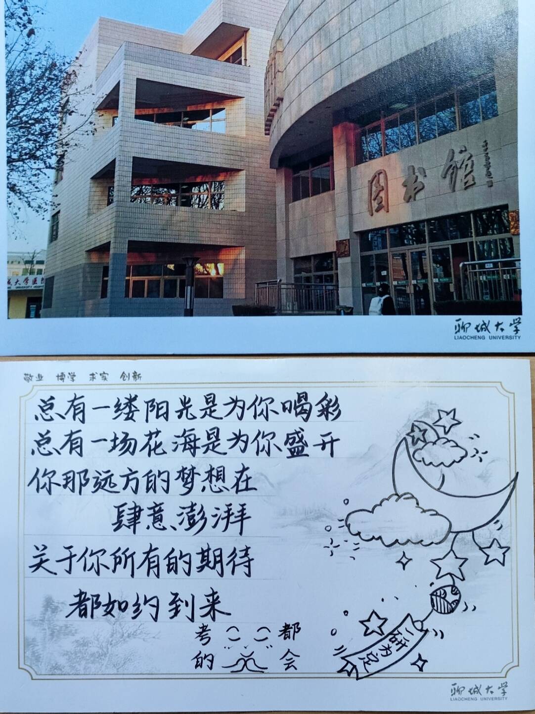 一句祝福,一语鼓励,化作奋笔疾书的动力。2023级2班华龙钰用不同颜色笔触与不同风格字体装点明信片,精美饰品寓意美好、满含期许,祝福考研学子“一战成‘硕’”,为考研学子增添勇气与动力。2023级3班张莉芸用绘画、贴纸等形式点缀明信片,言语生动活泼、鼓舞人心。她为考研学子夜以继日的努力点赞,为他们孜孜不倦的态度喝彩,字里行间蕴藏美好企盼。2023级5班王晴将暖心鼓励汇聚于一封书信,言语中饱含浓浓关爱与真挚关怀。她设身处地,推心置腹,希望考研学子劳逸结合,保持身心健康,以最好状态迎接考试。2023级5班时婧怡言辞恳切,字体优美,真诚祝愿考研学子在求学旅途中收获成长,塑造坚韧品格,磨炼坚强意志。2023级6班张明慧为考研学子书写贺卡,字体端庄流利,话语铿锵有力,承载温情祝愿。她鼓励考研学子锚定目标,挖掘动力,实现人生理想。手写礼物汇聚浓浓情谊,在严冬中注入微光与暖心。
