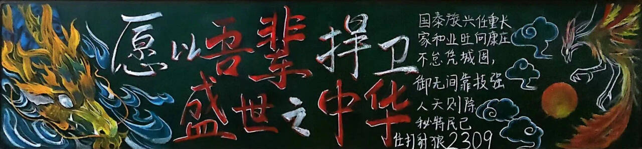 2023级学生利用课余时间绘制出一幅幅图文并茂、精彩纷呈的黑板报。2023级9班的黑板报色彩鲜明,左右两侧绘制的龙惟妙惟肖,呼之欲出,象征作为“龙的传人”的吾辈青年开拓奋进,传递出积极向上、不断进取的精神。2023级3班的黑板报着重强调国家安全内容与意义,加以五星红旗和向日葵等图样为点缀,图文结合,彰显国家安全的主题。2023级9班和2023级10班的黑板报构思新颖,版面设计精巧,右侧的华表柱寓意中华民族社稷永固。2023级5班的黑板报布局有致,排布鸽子、花朵、烟花、仙人掌等多样元素,插图生动活泼,图文搭配和谐,教育意义鲜明。2023级3班的黑板报整洁清新,大片向日葵代表青年坚定意志和积极向上的人生态度。