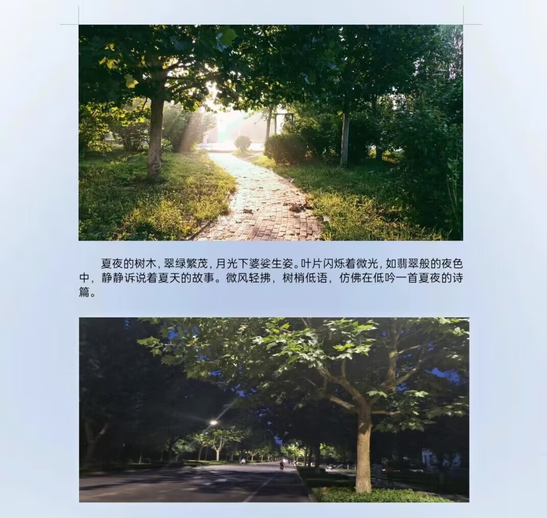 参赛作品以夏季为主题,参赛者用图片和文字记录郁郁葱葱的夏天。2022级1班李璐妍凭借一系列构图独特、色彩鲜明的摄影作品,将天空、白云、石板路和高楼大厦等元素巧妙融为一体。她灵活运用色彩对比和光影变化,将夏日的热烈与宁静、繁华与清新交织在一起,营造诗意画面,展现勃勃生机。她以独特视角和深刻内涵诠释自己对生命与情感的感悟,展现当代青年学生审美追求和艺术素养,传递积极向上的价值观。2023级6班王岩的摄影作品中阳光散射,树影婆娑,落日余晖铺满辽阔天际,自然万物迸发盎然生机。她以聊大校园为素材,整体风格简洁清新,呈现出聊大校园的独特魅力和青春学子的蓬勃朝气。参赛者们用镜头捕捉温馨画面,记录触动人心的时刻,将平凡瞬间赋予永恒价值。