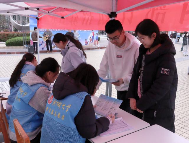 咨询会现场,志愿者们积极为前来咨询的同学发放西部计划宣传册和报名流程图,同时耐心解读西部计划政策并回答相关问题。他们结合当地实际情况说明政策落地的具体举措,并从国家战略层面系统阐述西部计划对于推动区域协调发展、促进人才交流的重要意义。针对西部计划志愿者的选拔标准,志愿者们从政治素质、专业技能、身体素质等多个方面进行解析,特别提醒需重点准备的考核环节。志愿者们条理清晰,逐一介绍注册账号、填报岗位、审核盖章以及笔试面试等环节的具体流程,推动同学们更清晰地了解西部计划的相关内容。李承虎详细询问咨询会的组织情况,并结合西部计划的实际需求以及同学们个人发展规划给予了详细的指导,鼓励同学们积极投身西部计划,在祖国西部的广阔天地中贡献青春力量,实现人生价值。