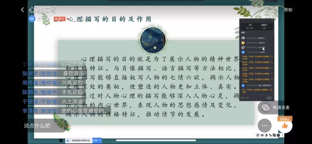 本次PPT制作比赛的开展是为网上支教活动做准备,并以“增强学生的作文心理描写能力” 为主题,其中2018级6班吴鑫凤的作品结构严谨,用幽默风趣的语言概括知识,并且选取三个典型的视频进行举例,作品最终被选为第二期网上支教活动的授课课件。有过第一期网上支教的经验,此次网上支教的老师们讲课更加熟练。2019级1班刘雨荷、逄鹤对知识点进行详细讲解,将知识点与事例充分结合,使小学生牢记知识点;完整的课堂离不开学生与老师的交流,2019级1班马新儒采用连麦的形式实时听取小学生的问题并予以解答,而谭晓彤则通过提问的方法帮助小学生扎实记忆学习内容,在一问一答中收获写作技巧;小学生具有无限的想象力,2019级5班方雨晴便抓住这一点,鼓励小学生大胆想象,用天马行空的想象点缀作文。下课铃声响起,小学生们向老师们表达对下一次上课的期待,老师们也用名言警句激励他们努力学习。