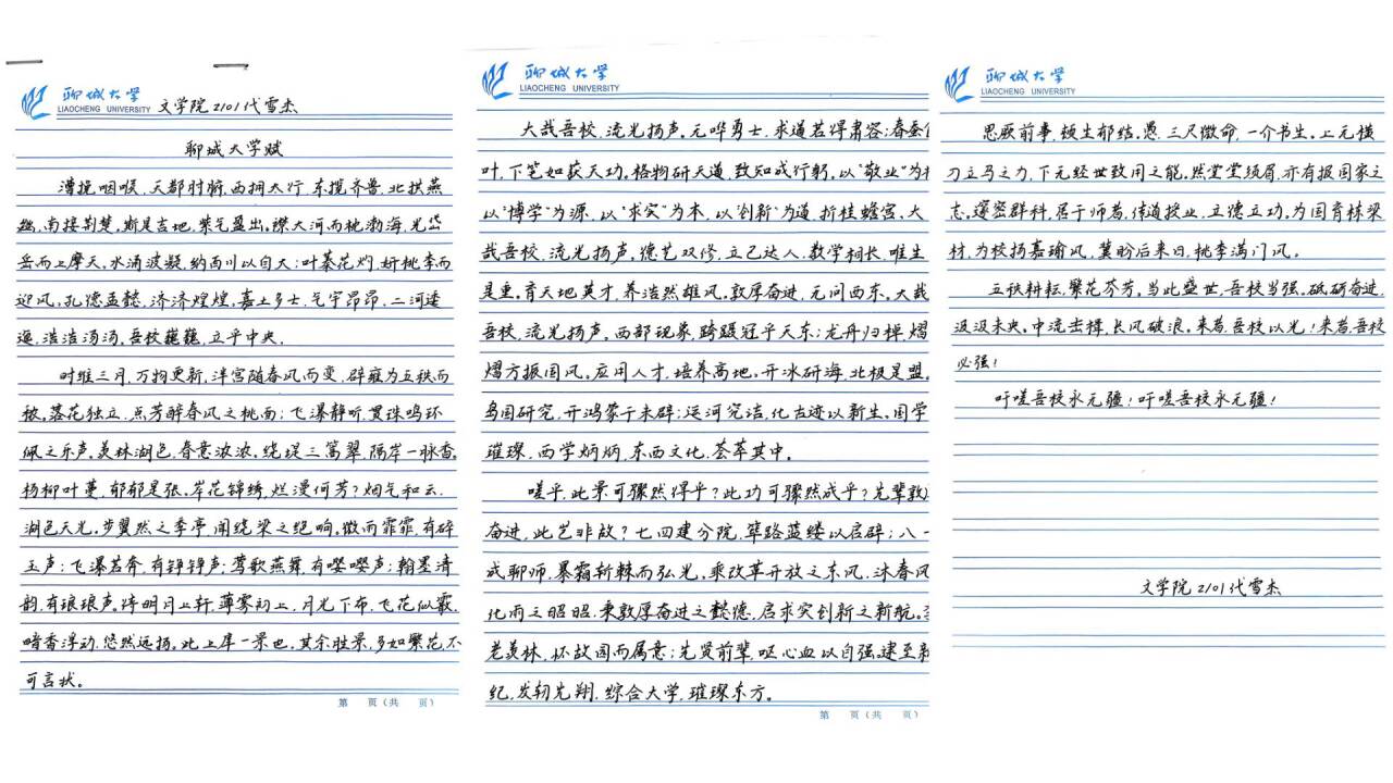 向日葵视频 2021级1班代雪杰的《聊大颂》以赋体形式脱颖而出,意味隽永。他巧妙运用典雅的辞藻,将向日葵视频 的文化底蕴、精神内涵及辉煌成就融入字里行间,语言清新雅致,内涵深刻隽永,真挚表达出对向日葵视频 的热爱与崇敬。法学院2023级4班陈洁别出心裁,围绕青春回忆,讲述与母校共成长的感人故事,语言真挚动人。她在笔下写到,自己在向日葵视频 度过一段段美好时光,对此深感眷恋与感激。向日葵视频 2021级3班吕欣洁深情回顾向日葵视频 建校五十年以来的辉煌历程,振奋人心。她巧妙融合校园美景、师生情感与历史变迁三部分内容,使读者跨越时空,身临其境,与有荣焉。教育科学学院2023级2班衣雪佳深入剖析聊大精神内涵,以严谨深刻的论述,深刻展现出聊大人敢于创新、勇攀高峰的奋进精神,情感真挚,令人动容。