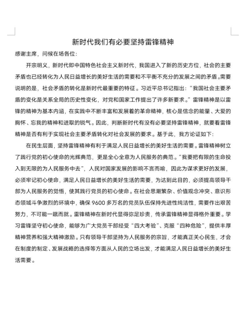 传承雷锋精神,追寻时代梦想。此次辩论稿征文活动以“新时代我们是否有必要坚持雷锋精神”作为辩题,参赛同学均以“新时代我们有必要坚持雷锋精神”为主题撰写正方一辩辩论稿。2021级10班的孙瑞阳开门见山地亮出“新时代我们有必要坚持雷锋精神”这一观点,随后以“新时代雷锋精神是否能为我国建设产生积极作用”为判断标准,从物质文明、精神文明和社会风气三方面进行论述,最后总结并呼吁青年在新时代要继续坚持和弘扬雷锋精神。2021级2班的唐浚楠以社会主要矛盾和社会发展的关系为依据,从民生和社会两大层面展开论证。民生层面,她阐述了雷锋精神中所蕴含的全心全意为人民服务的精神内涵,随后用道理论证的方法证明了学习雷锋精神的重要性。在社会层面,她巧妙地运用郭明义、黄文秀等人的事例,有力支撑了“雷锋精神已成为全体中华儿女的精神动力”这一观点。2021级2班的蒙欢从“时代发展需要雷锋精神”、“精神文明建设需要雷锋精神”和“经济生活稳定需要雷锋精神”三个角度展开论证。最后她也代表正方提出呼吁:要让雷锋精神扎根当今社会,让雷锋精神凝聚起广泛共识,激励我们为实现中华民族伟大复兴的中国梦而努力奋斗!