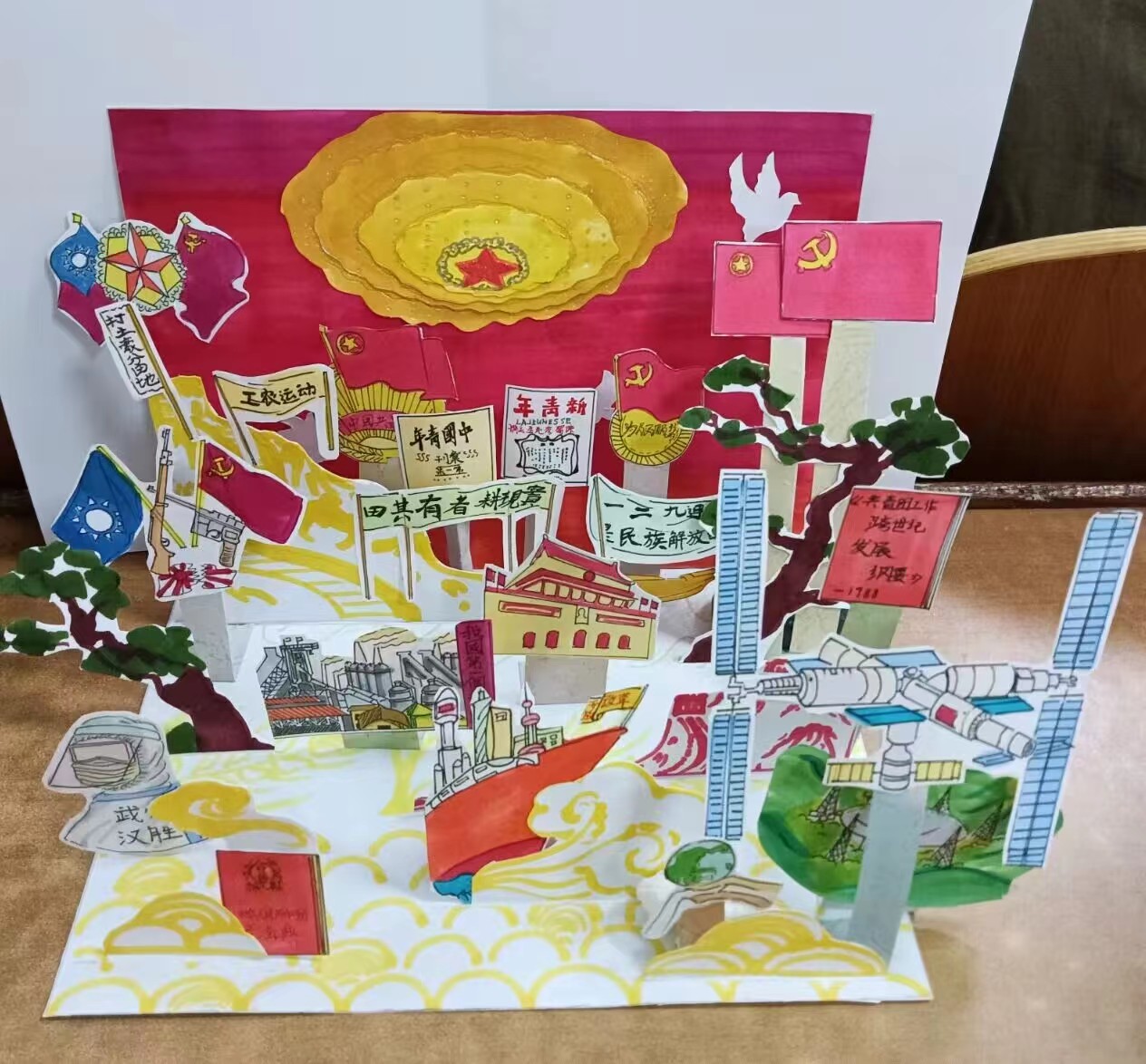 感悟峥嵘岁月,手绘幸福今朝。同学们融情于笔,绘情于画,将贺卡与党的奋斗历程、非凡成就紧密结合,以此讴歌党的伟大贡献,传承红色精神。2020级10班张硕结合时事,以一条红色之路作为线索,将神舟火箭、冰墩墩贯穿于作品中,展现出中国智慧、中国风采、中国力量。2022级4班杨晨采用立体设计,将党的奋斗历程分为旧时代党为人民做出的贡献和新时代党取得的伟大成就,借此鼓励同学们学习党艰苦奋斗的工作作风、勇于创新的时代思想和坚韧不拔的党员品格。2022级10班王雨萌的作品风格简洁大气,颜色丰富。贺卡主体部分运用中国传统书法和剪纸艺术,将“中国”二字中的龙鳞与龙头巧妙呼应,意味着中国将在党的带领下如巨龙般腾飞,同时她在作品中融入中国传统建筑及新时代科技成就等元素,使贺卡具有传统文化与现代科技的碰撞融合之美。