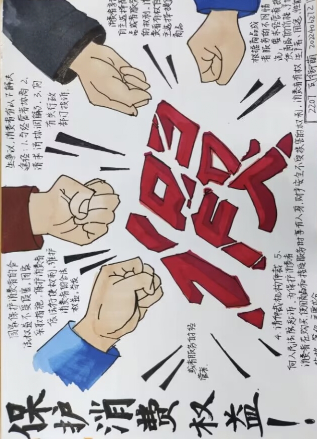消费安全需重视,维权意识待提高。参赛同学以绘制手抄报的方式表达自身对消费保障的见解,传达消费维权的思想。2021级8班赵雅芝将手抄报画面分为两部分,一部分用极具讽刺意味的贪财小丑形象,暗讽不良商家的欺诈消费者行为,另一部分用巍峨绚丽的层层高塔,表达消费者维护权益有法可依,其文字内容照应“以法德之剑,御权益之塔”的创作主旨,鼓励同学正确维权。2022级2班谷维嘉的手抄报通过冷暖色调互补的方法,使飘扬的红黄双色的幕布与在惊涛骇浪中远航的帆船形成强烈对比,展现消费者维护自身权益的正义性。2022级8班吴琬莹大挥笔墨,构思巧妙,将威严的法官与象征公正的天平相结合,整体画风雄浑大气,体现司法为消费者权益提供强有力的保障。2022级7班司御萌另辟蹊径,画法新颖,画面简洁,四只拳头凝聚力量,有力打向大写的“假”字,象征消费者打假的决心。