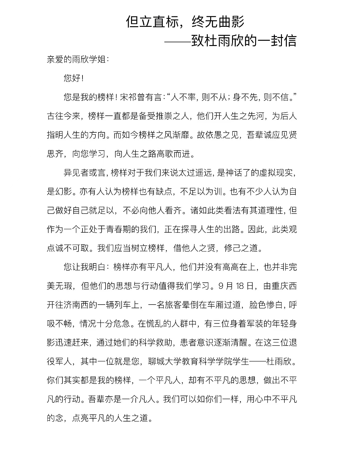 高山亦可仰,以此揖清芬。在用信件传达自己对杜雨欣的赞美与敬佩的过程中,同学们也切实地领悟到了榜样的力量。薛玉将杜雨欣的善举与时下以漠视为荣的不良社会风气相对比,深刻地突出其榜样力量之强大和对社会正能量的引领作用。冯蔚然以清新的笔触诉说出自己对真正的“美”的认识,在她看来,杜雨欣的美是一种旺盛的生命力,这种生命力流动在她挺身而出的英姿上,锻造出她独有的女性力量、中国力量。“夜光之珠,不必出于孟津之河;盈握之璧,不必采于昆仑之山”,郭峥认为平凡叙事中亦能诞生出不平凡的人生,杜雨欣身上的青年担当亦在她的身体力行中熠熠生辉。同时,她也积极呼吁莘莘学子在新时代以一片热忱的心来学习、践行这种榜样精神。