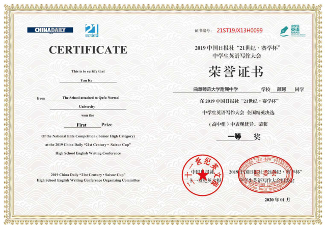 颜珂同学荣获2019中国日报社"21世纪·赛学杯"中学生英语写作大会一等奖。优异成绩的获得是颜珂同学平时自律自强、心怀壮志、艰苦奋斗的良好证明。颜珂同学优异的成绩也为学校争得了荣誉。在此,向颜珂同学表示诚挚的祝贺。