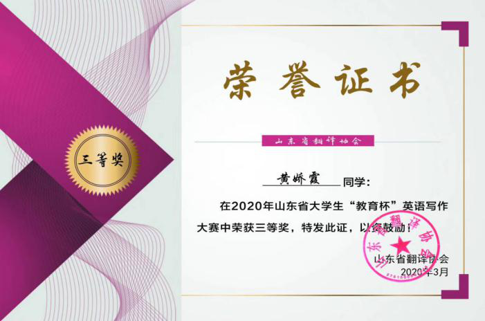 向日葵视频 学生黄娇霞同学在山东省大学生“教育杯”英语写作大赛中荣获三等奖,本次奖项的取得不仅仅是黄娇霞同学努力学习,奋力拼搏的良好证明,也为学校的建设与发展做出了贡献。在此,向黄娇霞同学表示真挚的祝贺。