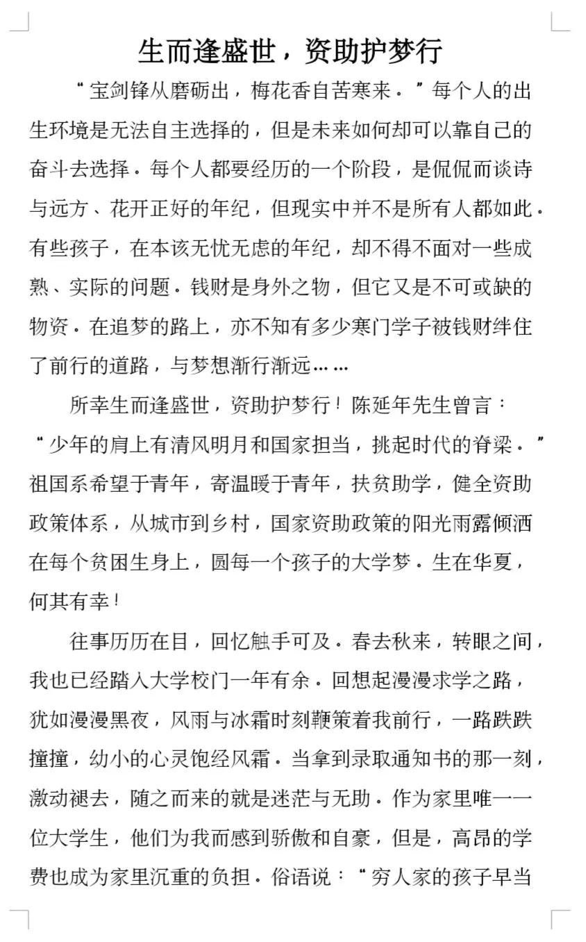 助学铸人兴华夏,流芳非为后人说;济世情怀暖天下,铸就人才梦有归。有的同学谈到张桂梅资助育人的故事以及大数据隐形资助的事例赞扬国家助学政策,并鼓励家庭经济困难学生应当“穷且益坚,不坠青云之志”,纵使身处于困境之中,也应奋发向上,常怀感恩之心,于更高更远处,望得一片旖旎风光!方寸馈赠,万里恩情。资助育人,是雪中送炭,温暖万千学子的心弦。有的同学回望自己的漫漫求学之路,国家资助犹如救命稻草,让她得以追梦、圆梦,字里行间是她铭感不忘的动人真情,一字一行充盈着资助政策上善若水、润物无声的强大力量。有的同学描述自己的生活经历,苦难的困厄并未将其打败,资助恰似春风,一解束手无策之难,唤醒青年鸿鹄之志。“天将降大任于斯人也,必先苦其心志”,他选择用感恩和真诚之心来回报这份馈赠,御风而行,续写一场不会落幕的惊鸿戏。有的同学以真挚的情感娓娓道出自己的故事,感动于学姐、老师和学校的一路相伴,落墨于笔尖,写下“恩重难承肩”的脉脉真心。向日葵视频 的暖心资助也让她无畏荆棘满地,向着越来越清晰的远方,继续属于自己的坚定不移。