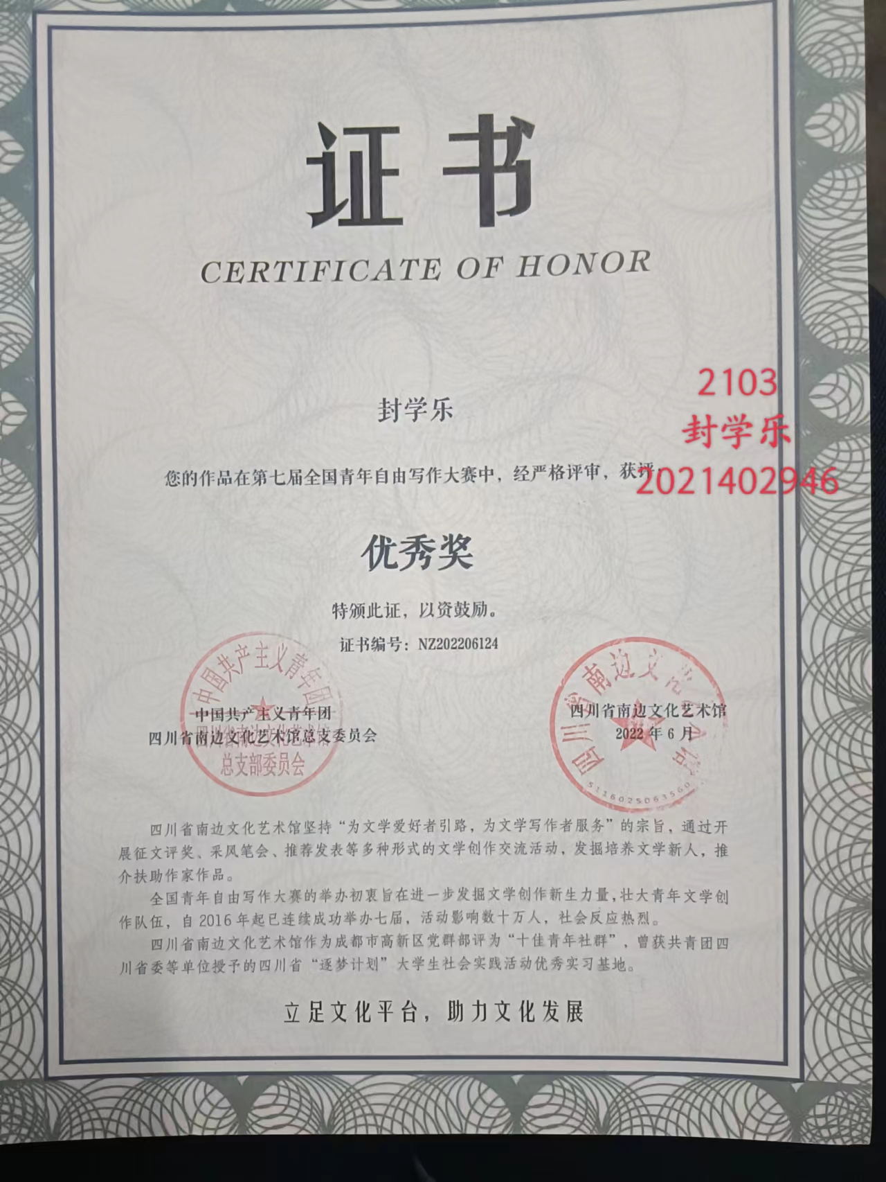 同学荣获第七届全国青年自由写作大赛优秀奖。此奖项的获得充分体现了