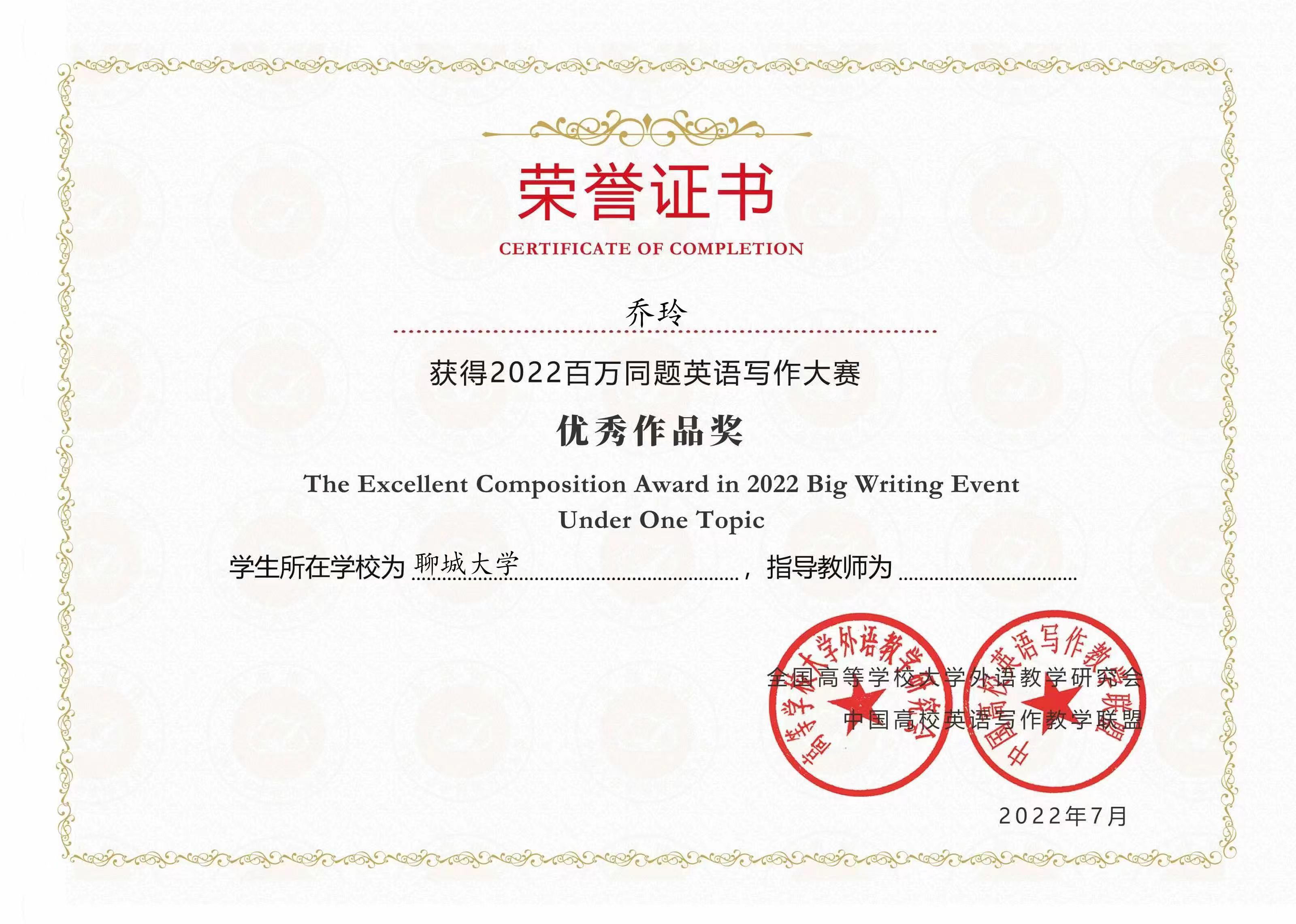 2022百万同题英语写作大赛优秀奖。此奖项的获得充分体现了