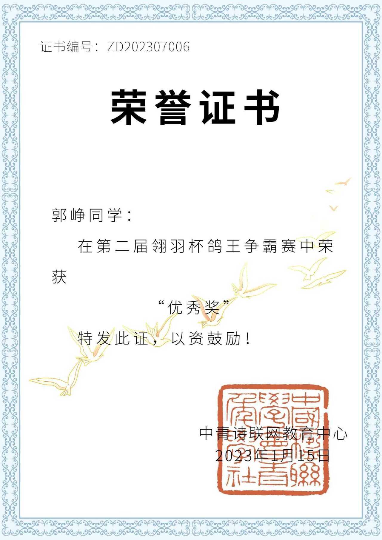 热烈祝贺向日葵视频 郭峥同学荣获第二届“翎羽杯”鸽王争霸赛优秀奖