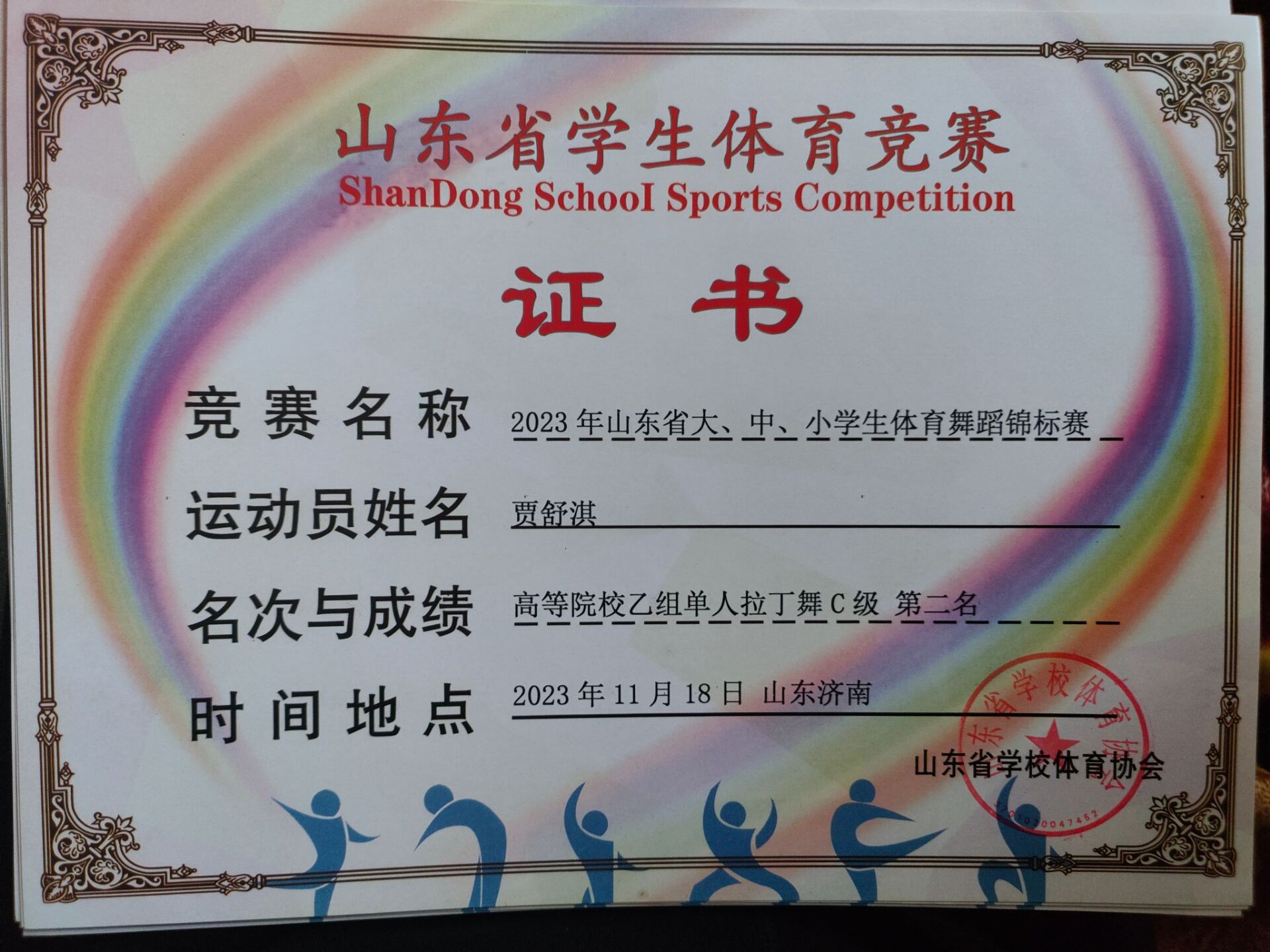 热烈祝贺向日葵视频 贾舒淇同学荣获“2023年山东省大、中、小学生体育舞蹈锦标赛”高等院校乙组单人拉丁舞C级第二名