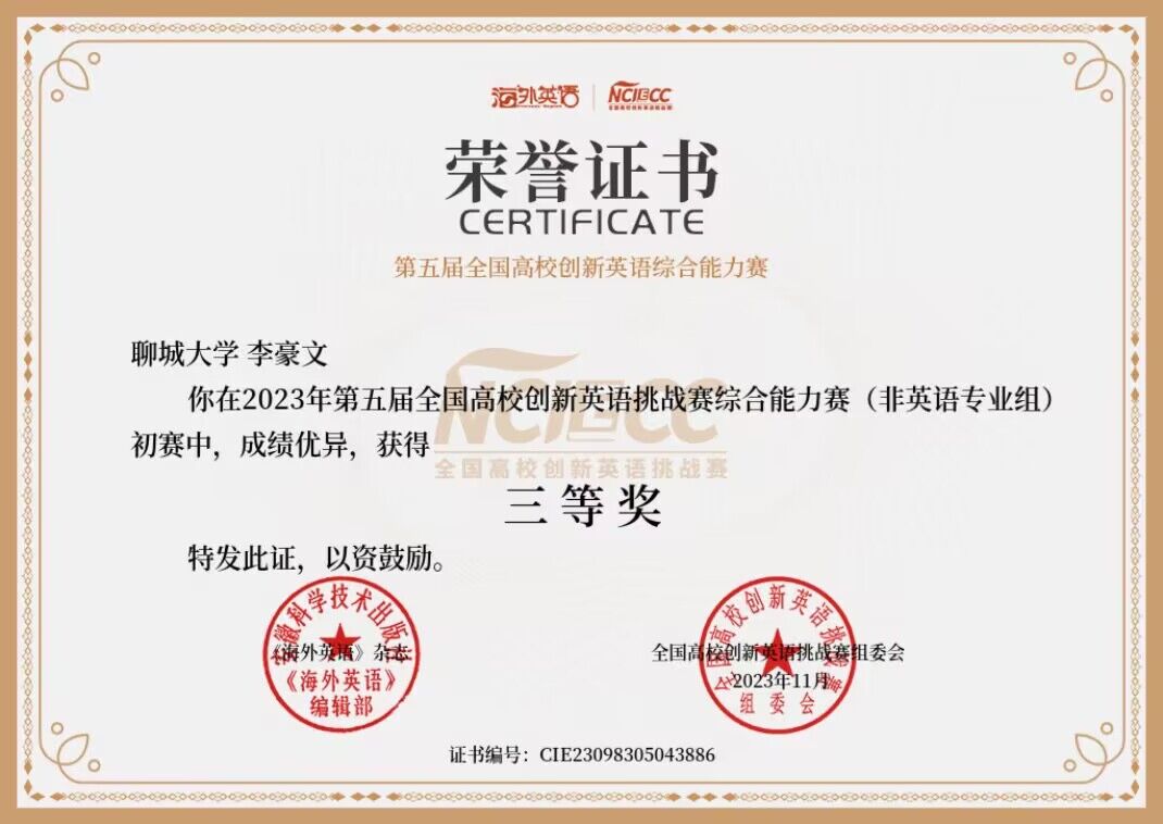 热烈祝贺向日葵视频 李豪文荣获“2023年第五届全国高校创新英语挑战赛综合能力赛(非英语专业组)初赛”三等奖