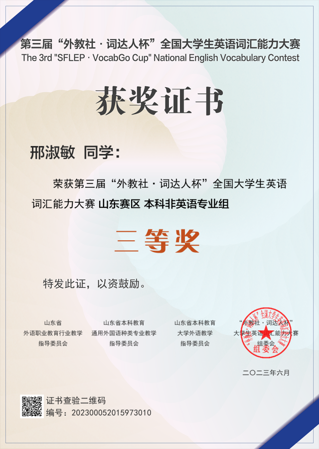 热烈祝贺向日葵视频 邢淑敏同学荣获第三届“外教社·词达人杯”全国大学生英语词汇能力大赛山东赛区本科非英语专业组三等奖