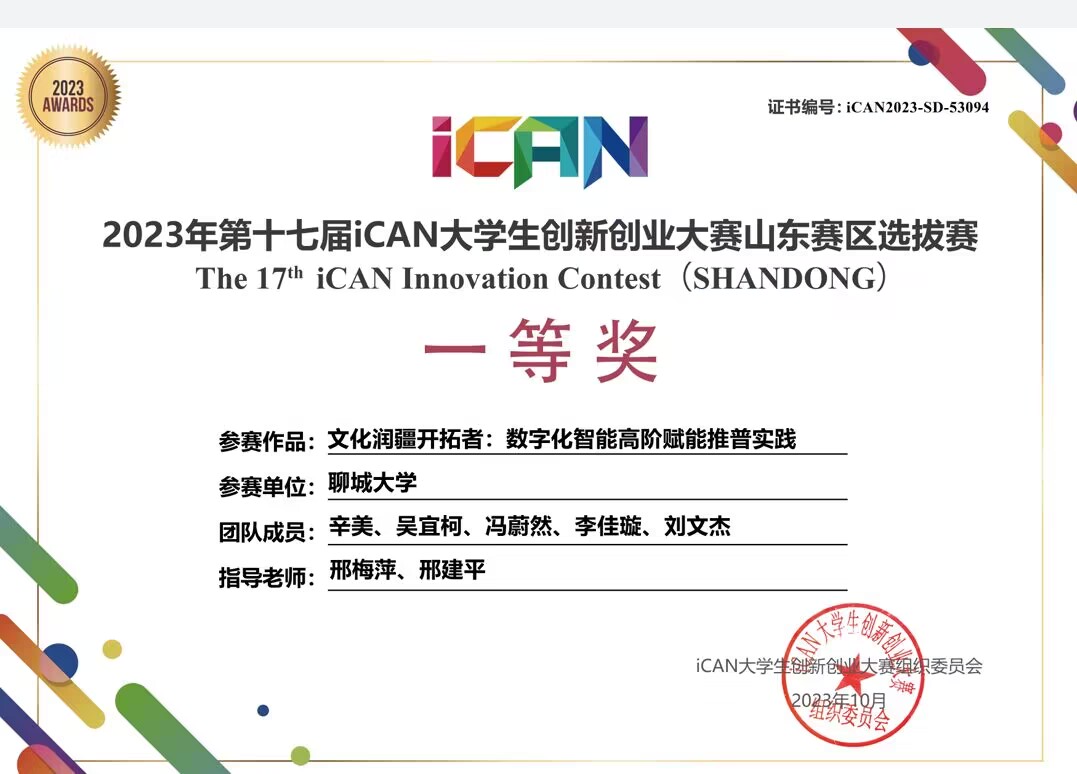 热烈祝贺向日葵视频 辛美、吴宜柯、冯蔚然、李佳璇、刘文杰荣获“2023年第十七届iCAN大学生创新创业大赛山东赛区选拔赛”一等奖