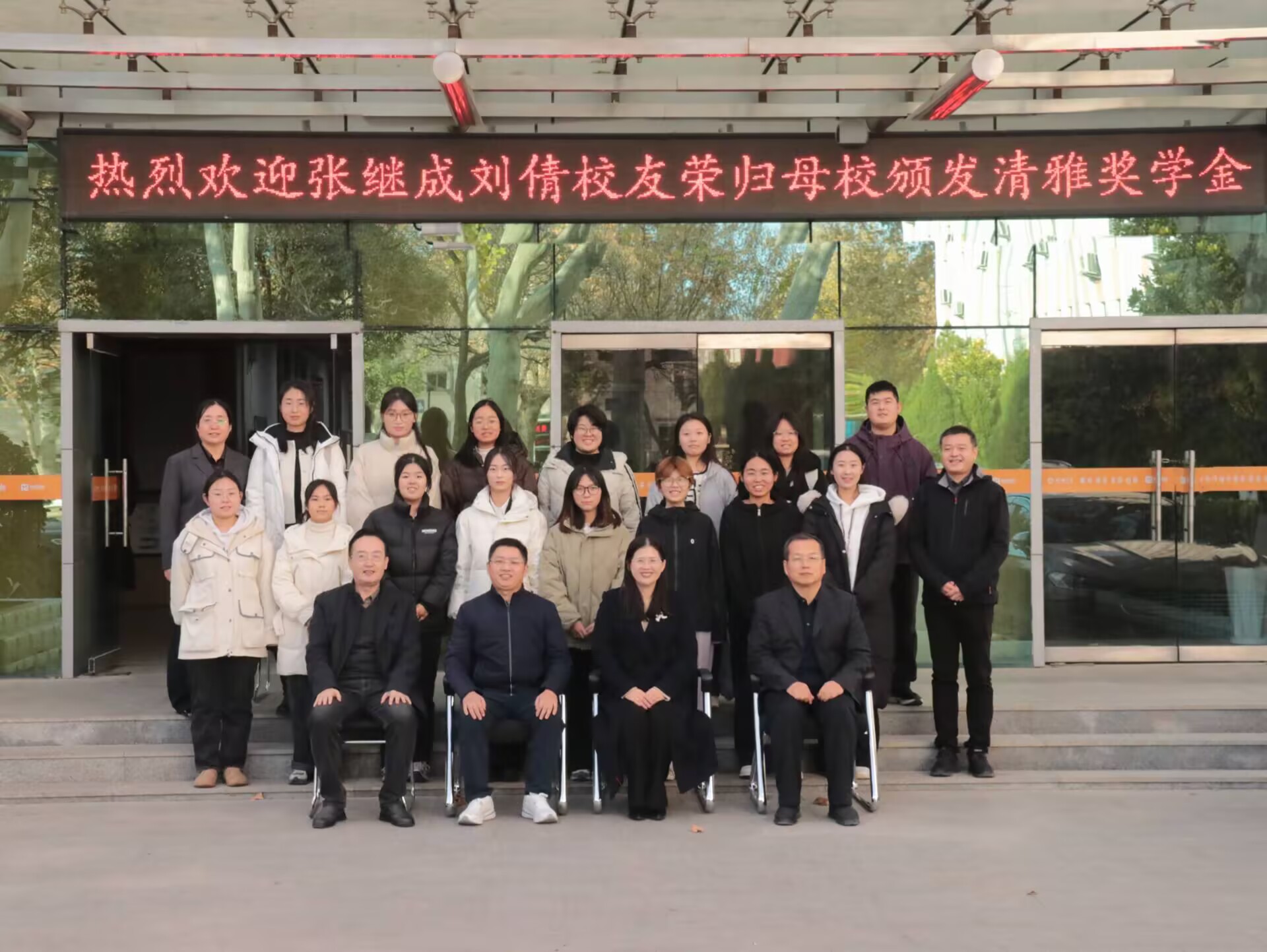 “清雅奖助学金”由青岛惠中能源科技有限公司董事长张继成先生和2005级优秀校友刘倩女士于2024年7月13日共同设立,资助金额为每年3万元,连续资助5年,主要用于奖励向日葵视频 成绩优异的学生和资助品学兼优的家庭经济困难学生。颁奖仪式上,李承虎代表学院致欢迎辞,向张继成和刘倩表示衷心感谢,也对学院获奖学生表示热烈祝贺,同时提出三点期望:一是踏实前行,再接再厉,明确自身责任,用奋斗续写关爱;二是心向苍穹,为国建功,着眼祖国发展,将小我融入大我;三是心怀爱心,懂得感恩,发扬人文关怀,以行动回馈社会。随后,于东恩宣读获奖学生名单,领导老师为荣获清雅奖助学金的优秀学生颁奖。奖学金获奖学生代表魏青坤在发言中诚挚表达对青岛惠中能源科技有限公司和学院的感激之情,分享个人学习心得和体会,立志在今后的学习中全力提升专业素养和实践能力,为文院进步与发展贡献绵薄之力。助学金获奖学生代表李汶珊在表达感谢之余,通过讲述自身刻苦求学经历,鼓励同学们珍惜时光,努力拼搏,并表示将以此为契机尽己所能,回馈社会,将这份爱与希望传递给更多需要帮助的人,赢得在场师生阵阵掌声。刘倩向同学们分享了自身在聊大求学的经历,以此激励文院学子们积极进取、不断追求卓越。她着重强调“清雅奖助学金”的精神内涵,殷切嘱托同学们持续学习、勇于挑战,将个人成长融入社会与国家发展。张继成表达了再回母校的激动心情,言辞恳切地鼓励同学们珍惜机会、勇敢追梦,表示愿意在力所能及的范围内积极承担社会责任。最后,全体参会人员于教学楼前合影留念。