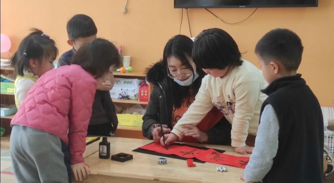 楹联是极具生命力的艺术,历经千年,长盛不衰,具有言简意深、对仗工整、平仄协调等独特艺术形式。声律启蒙歌作为儿童学习的重要工具,其声韵协调,琅琅上口,对楹联文化中声律知识的学习大有裨益。为帮助孩子们更加直观形象学习楹联中的声律知识,让楹联知识在孩子们心中长出萌芽,李艾霞带领孩子们学唱声律启蒙歌,孩子们兴致盎然,积极参与学习。期间2019级10班的同学为孩子们分发糖果和零食,与孩子们愉快交流,现场画面温馨动人。笔墨情韵,写意人生,指尖下舞动的书法艺术荟萃着中华文化的精髓。徐雪丽将毛笔字中所展现的书法之美与楹联中的趣味相结合,并以今年的的生肖年“牛”为主题,寓意着新年新气象,与孩子们共同完成一幅幅充满年味的楹联作品,在拉近与孩子们的距离同时也让他们切身感受到楹联文化的独特魅力。王舒宁则为孩子们播放宣传片《楹联里的中国》,为孩子们更深入了解楹联文化构筑一座桥梁,通过宣传片的学习孩子们会对楹联知识的学习留下更加深刻的印象。