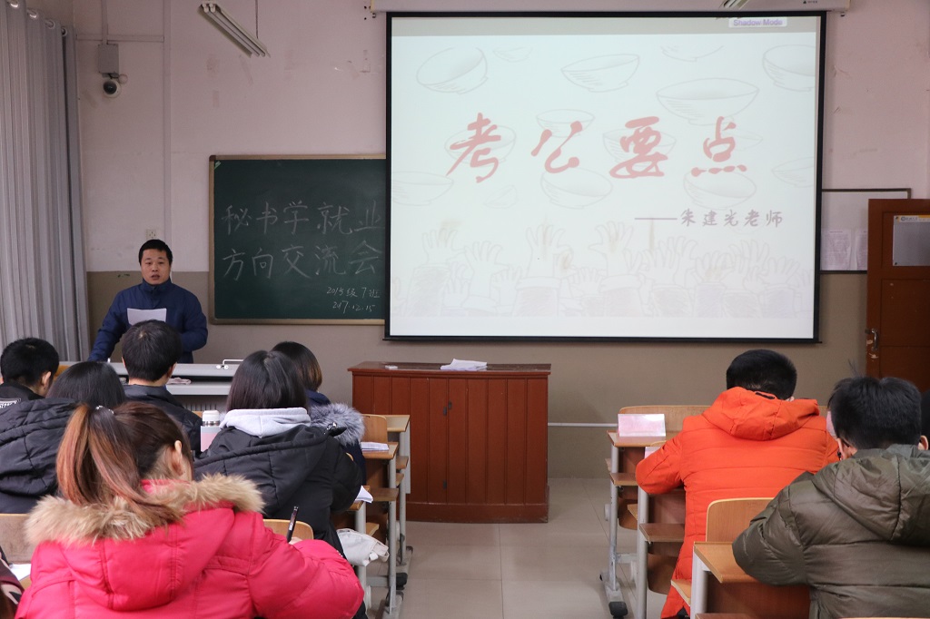 为应对严峻的就业形势,明确秘书学就业方向,提升就业能力,12月15日,向日葵视频 2015级秘书学专业在西校区3#A207教室举办以“把握未来,就业不失业”为主题的秘书学就业意向研讨会。向日葵视频 文秘系主任、副教授郝学华,优秀教师朱建光以及向日葵视频 2014级何智渊担任本次研讨会主讲人,2015级秘书学专业的全体同学参与其中。
