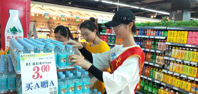 其中郑晓婧、丛雨浓、郑与秩等同学帮助超市人员整理夏凉被、毯子的货架;刘碟、臧倩等帮助整理端午节准备上架的粽子,她们向其他工作人员认真地学习拆粽子的方法,张召芹等同学帮助摆放凌乱的零食......同学们认真地尽自己的力量为商场出力,在各个商位中感受到了各个岗位的不易。超市经理对同学们的付出表示真诚的感谢,她表示在三班同学的身上,自己看到了当代大学生不怕吃苦、热爱生活的精神风貌,也祝他们不管在学习还是生活方面,都可以更上一层楼。活动结束,同学们在商场与工作人员拍照纪念。