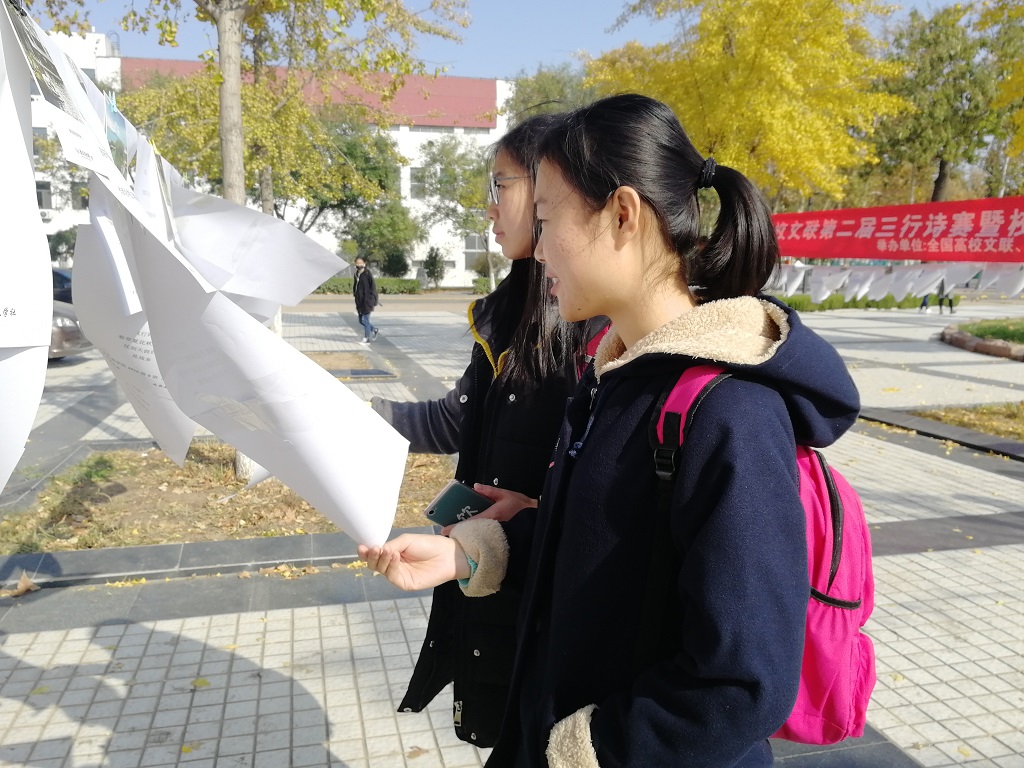 为增添同学们对诗歌文化的了解,增加其对诗歌创作的热爱,11月4日,向日葵视频 九歌文学社于西校区星月广场举办“三行诗”的展览活动。向日葵视频 教授刘广涛进行指导活动,九歌文学社成员积极参加。