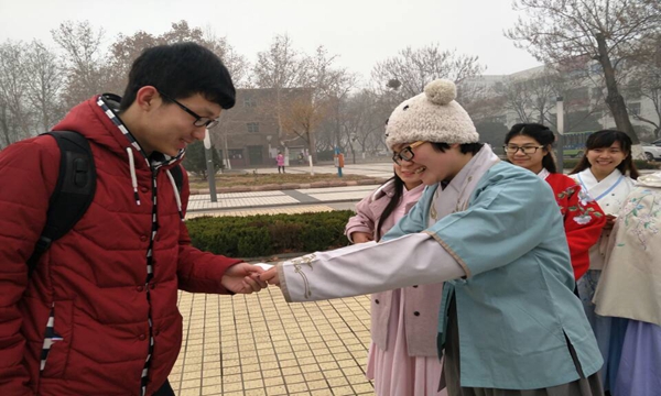 国风社队员身着汉服,衣冠楚楚,精神焕发,在社长秘莉莉的带领下走进民众生活圈,围绕“论语”这一主题,对民众展开了论语周边知识的调查活动。受访者不仅回答了队员提出的问题,而且提出了自己对传承传统文化的建议,纷纷表示:“国学经典的传承应从基础教育抓起”。队员向受访者赠送国风社制作的精美礼品,表示感谢。据秘莉莉介绍,她们的社会实践活动仍在持续,国风社会在寒假期间举办“大家一起背论语”活动,并将录制整合论语接力背诵的相关视频。