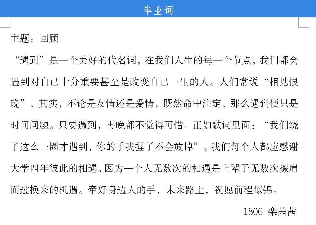 校园时光尽,青春不散场。回望尽头留下青春岁月,展望前方不尽似水流年。今天的离别不是结束,而是新的开始。活动一经宣传,便引起广泛响应,同学们踊跃报名,积极参加。活动以祝福毕业生为主题,鼓励同学们以歌舞形式抒发对毕业生们的美好祝愿。参赛作品异彩纷呈,同学们纷纷大显身手:朱文欣的歌曲串烧《送别+时间煮雨》悦耳动听,娓娓歌声诉说出离别的伤感之情;张嘉莉的吉他弹唱《那些花儿》勾起同学们心中对大学生活的无尽回忆;栾茜茜的歌曲《遇到》婉转悠扬,从不同的角度解读毕业的意义。骊歌曼舞,同学们为毕业的学长学姐献上自己最真挚的祝福。经过激烈角逐,评委们秉承公开、公平、公正的原则,评选出名次,本次活动圆满结束。
