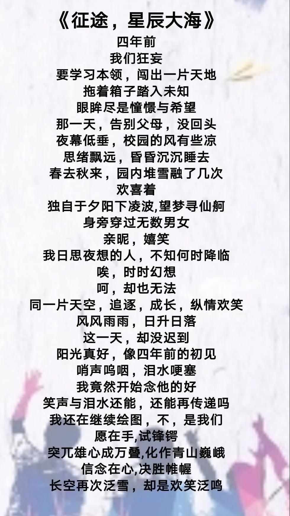 本次活动以诗文共赏(原创诗歌文章创作)和朗诵的形式进行。参赛者围绕“送别、祝福、理想、奋斗”的主题,将千言万语凝成字字珠玑的文章或短小精悍的诗歌。庄岩的现代诗歌《六月里的故事》中“愿我送去的祝福,伴你风雨一程,”把对毕业生的美好祝福用生动的笔触勾勒描绘出来。饱含情感的诗文朗诵,或壮志满怀地表达同学们对毕业生由衷的祝福,或含蓄委婉地道出依依惜别之情。王雪梅的《征途,星辰大海》,道出前途似海、来日方长的祝愿;赵艺斐的《毕业季》,书写青春演奏的篇篇乐章。长亭外,古道边,芳草碧连天,启航扬帆壮志满,今夕别校园。