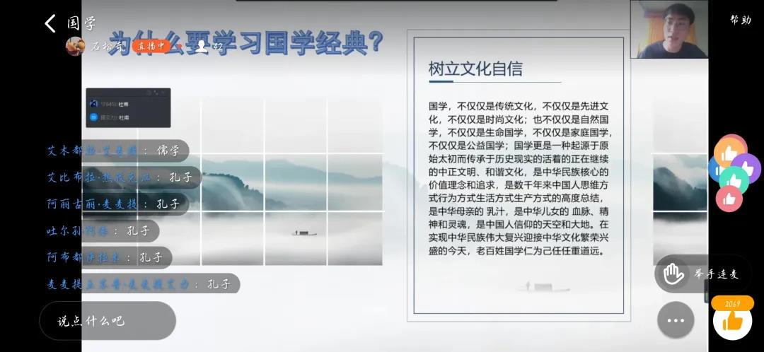 课程开始前,团队建立群聊和孩子们进行亲切友好的互动,拉近老师同学间的距离。在为期14天的活动中,团队结合去年已有经验和今年线上发现问题,开展针对性教学,开设攻克普通话基础课程、“专题人物”国学课程。活动开始之际,李宝田简要介绍“国学经典邮递员”组织,并对去年新疆分队获得的成果,做出展示。