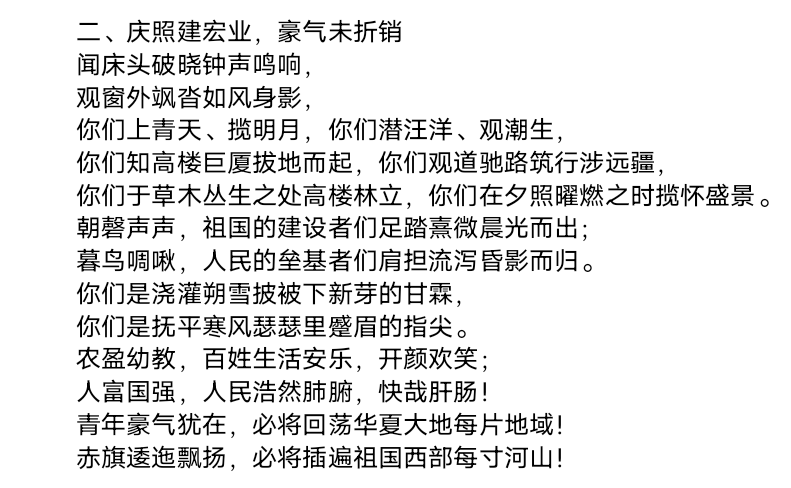 关注西部发展,歌颂奉献精神。同学们深入了解“西部计划”后,发现越来越多的优秀青年选择前往西部基层,用实际行动践行"弘扬繁森精神,西部建功立业"的青春誓言。西部计划志愿者在基层留下青春的脚印,挥洒奋斗的汗水。感动于“奉献、友爱、互助、进步”的志愿精神,同学们落笔于情,写下一首首动人的诗歌。孟伟捷以“寻找一双眼睛”起笔,思绪一路飘飞,落笔于远离霓虹的西部,借西部志愿者的眼睛写出他们内心的澄澈;侯梦蝶将拳拳之情诉诸笔尖,单押成韵,赞美志愿者们“不为世俗的眼光,只寻内心的善良,守候心中那片未曾耕耘的神圣土壤”,让人感动之余更觉诗歌韵味;吴浩然以蒲公英为喻,写下“风刮去年华留下种子,终有一日,在每一处满天绽放”,用满天星和霞草赞美西部志愿者的美丽坚韧、团结奉献,使人读毕潸然泪下;于文浩用跑马、草原、苍鹰、碧水还原志愿者一路向西的景色,又将天山雪莲和傲霜寒梅比作志愿者,赞美他们绽放在祖国最需要的地方。