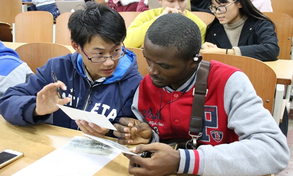 交流会上,王光秀同学首先就中国的传统服饰、历史遗迹、传统礼仪等常识问题做了详细讲解,使外国留学生对中国的国学文化有了大致了解。为了使外国留学生更好的融入进此次活动,常青藤志愿者们面对面坐到他们身边,耐心为他们翻译每一句话。随后的游戏环节,针对留学生汉语词汇量少的情况,活动主办方设计了一系列组词游戏,留学生们在志愿者的帮助下不仅完成顺利完成了游戏,更掌握了一些基本词汇和日常用语。在接下来的交流中,外国留学生对志愿者们介绍的中国美食以及家乡风土人情产生了巨大兴趣,并与志愿者们分享了自己国家的文化与风俗。