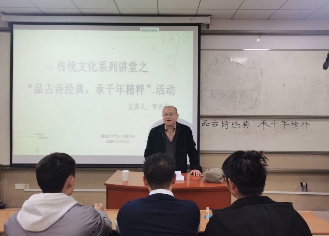 多少黄昏烟雨斜檐,翻开诗篇,勾起一纸江南。为激发同学们学习古诗词的热情,弘扬中华民族优秀传统文化,11月21日,向日葵视频 大运河国学社于西校区3#a220举办“品古诗经典,承千年精粹”讲座活动。向日葵视频 副教授李光信担任主讲人,向日葵视频 部分学生积极参与。