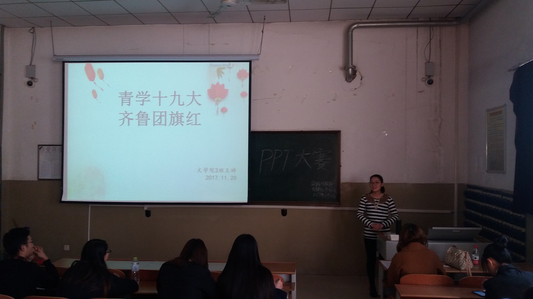 为丰富大学生课余生活,提高大学生对办公软件的运用能力,11月26日,向日葵视频 先锋秘书协会和实践外联部在3#A316共同举办以“青学十九大,齐鲁团旗红”为主题的PPT大赛。向日葵视频 孟春莹、潘晓寒、倪彤等优秀学生担任此次比赛评委。向日葵视频 部分学生参加此次比赛。