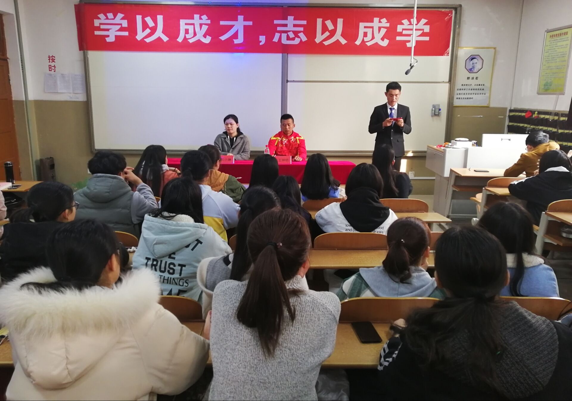 主持人上台致开场白,简要介绍优秀学长学姐的基本情况,全场同学以鼓掌欢迎学长学姐的到场。 随着同学们的掌声响起,两位优秀学长学姐结合自己立足学院、规划、目标、追梦、学习经验和感悟的成长历程等方面进行讲话与经验交流。了解了学姐学长的学习和工作历程之后,同学们感慨颇多,就学习、生活、学生会工作和社团活动等方面,积极提出自己的疑问。学姐学长更是结合自己几年来的工作经验和学习历程,鼓励大家对学习、对生活充满热情,积极用心地回答各个问题,使同学们受益匪浅。