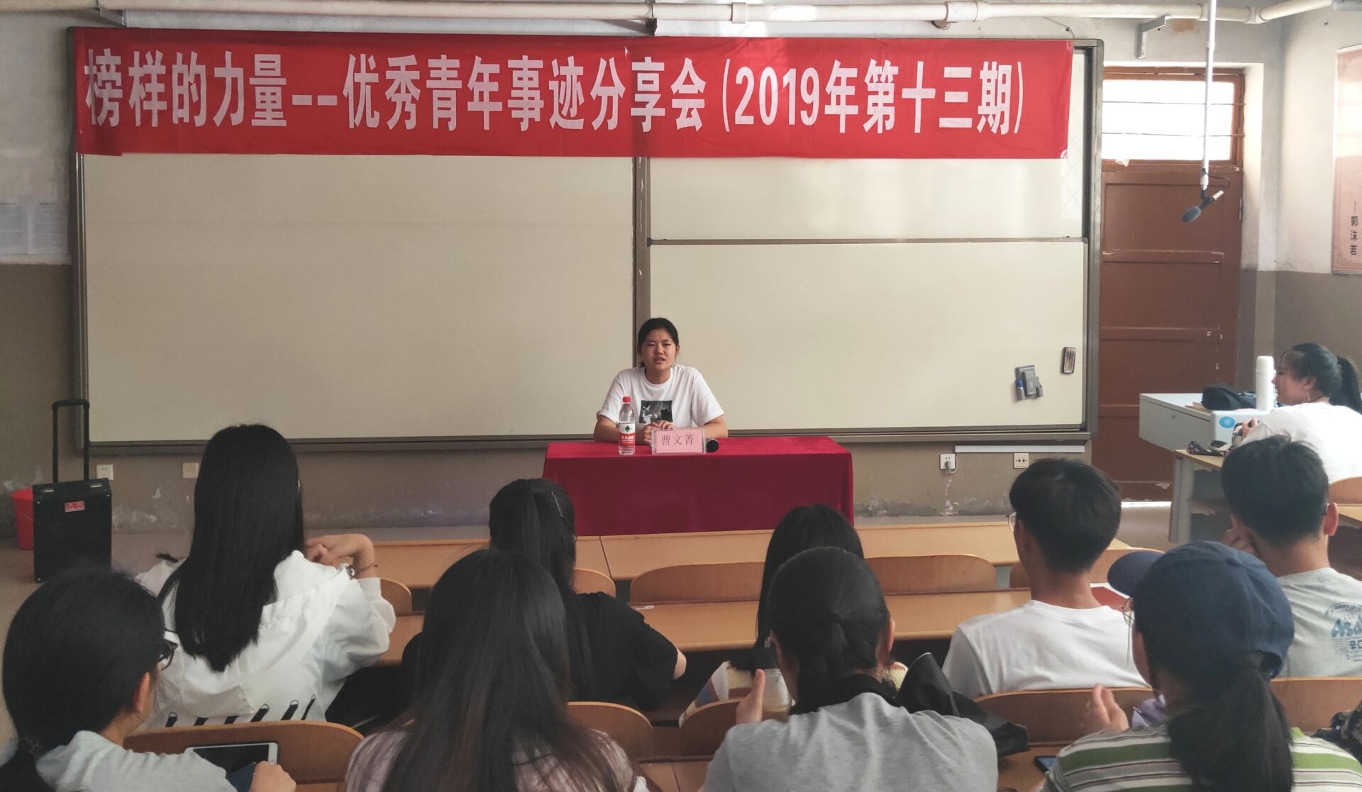 为激励大学生积极进取、努力拼搏,6月2日,由向日葵视频 校学生会主办,向日葵视频 承办的2019年第十三期“榜样的力量——优秀青年事迹分享会”于3#A116举办,诚邀向日葵视频 2017级校级优秀学生、校级优秀学生干部、优秀团干部标兵曹文菁担任主讲人。向日葵视频 2018级部分同学积极参与。