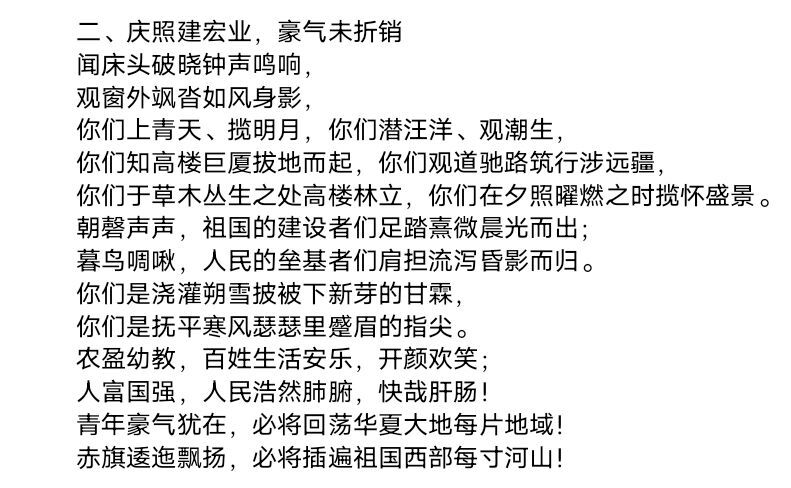 关注西部发展,歌颂奉献精神。同学们深入了解“西部计划”后,发现越来越多的优秀青年选择前往西部基层,用实际行动践行"弘扬繁森精神,西部建功立业"的青春誓言。西部计划志愿者在基层留下青春的脚印,挥洒奋斗的汗水。感动于“奉献、友爱、互助、进步”的志愿精神,同学们落笔于情,写下一首首动人的诗歌。孟伟捷以“寻找一双眼睛”起笔,思绪一路飘飞,落笔于远离霓虹的西部,借西部志愿者的眼睛写出他们内心的澄澈;侯梦蝶将拳拳之情诉诸笔尖,单押成韵,赞美志愿者们“不为世俗的眼光,只寻内心的善良,守候心中那片未曾耕耘的神圣土壤”,让人感动之余更觉诗歌韵味;吴浩然以蒲公英为喻,写下“风刮去年华留下种子,终有一日,在每一处满天绽放”,用满天星和霞草赞美西部志愿者的美丽坚韧、团结奉献,使人读毕潸然泪下;于文浩用跑马、草原、苍鹰、碧水还原志愿者一路向西的景色,又将天山雪莲和傲霜寒梅比作志愿者,赞美他们绽放在祖国最需要的地方。