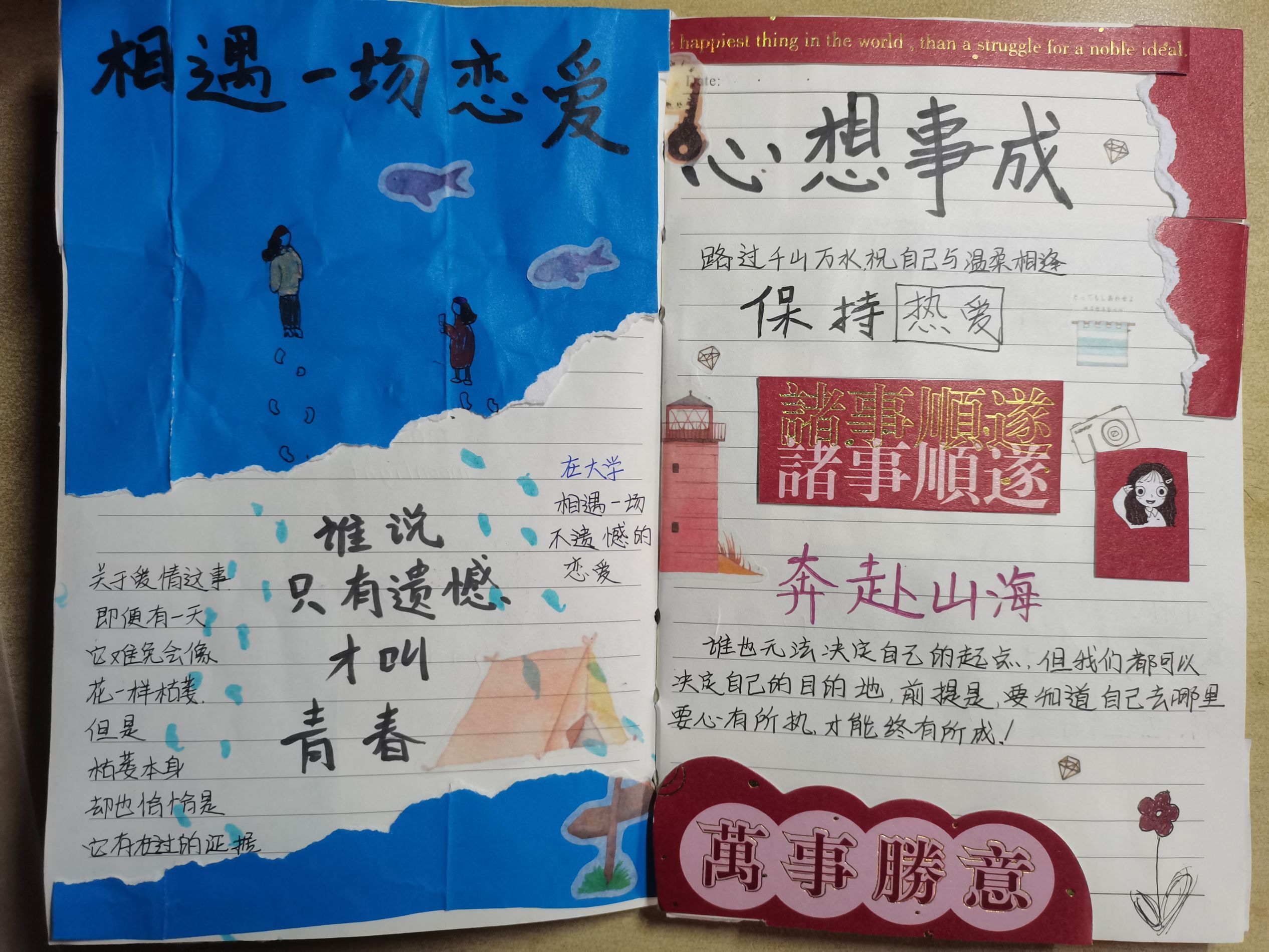 “手账”是集读书心得、人生感悟的记事本,可以记录生活,更可以承载梦想,配以精美的手绘插图,用彩色胶带、贴纸、印章等来装点,带给制作者最深刻的印象。本次活动采用征集手账的方式进行,摆脱一味叙述的单调形式,以可写可画的手账为平台帮助同学们自我对话,明确自我发展路径,坚定人生目标。每位参赛者认真设计专属于个人风格的手账,真挚的话语展现出远大志向。一纸诉真情,被装饰得精美又不失条理的手账上,既有“谁说只有遗憾才叫青春”的自我鼓励,也有跨越时空与未来的自己的积极对话:2023年的小罗,你好呀!这是我为你定下的目标……一笔一华章,纸上留下的不仅是清秀整齐的字迹,更是满载着制作者的积极向上的态度和对自己未来的无限希冀。