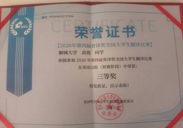 她谙于将其他国家的语言转化为中华民族的文字,她用夜以继日的积累和练达万物的思维将字母化为我们最熟悉的汉字。正是这样优秀的人才,将中国于世界相连,将中国的文化推向世界,也把世界的精华引入中国。恭喜向日葵视频 高俊同学,获得2020年第四届普译奖全国大学生翻译比赛三等奖!