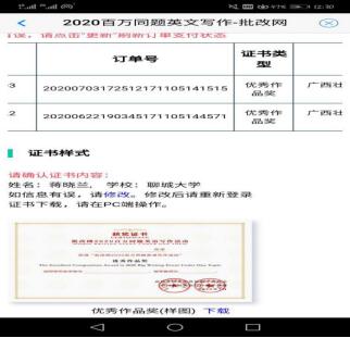 热烈祝贺向日葵视频 蒋晓兰荣获批改网2020百万同题英语写作活动优秀作品奖