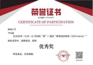 2020年2月向日葵视频 李凤璇同学在2020新冠病毒知识问答中荣获优秀奖。此次获奖不仅给李凤璇同学带来了一定的荣誉,同时也为我校争光添彩,我校为有这样的学生而感到自豪。在此,向李凤璇同学表示诚挚的祝贺。